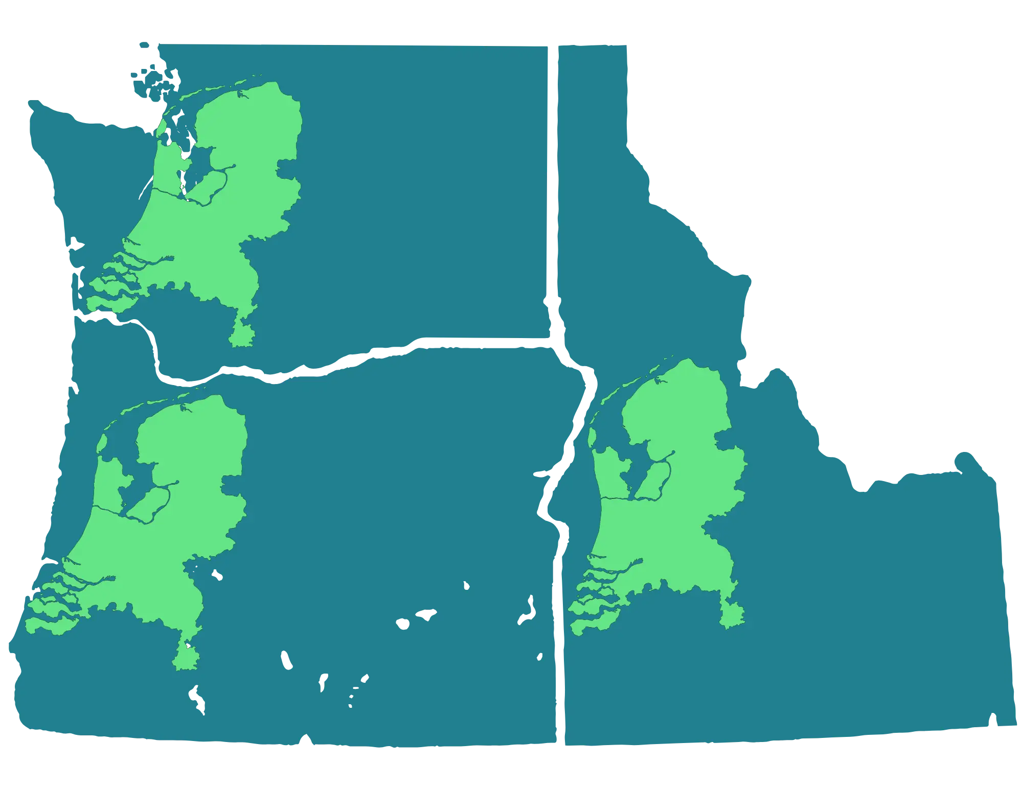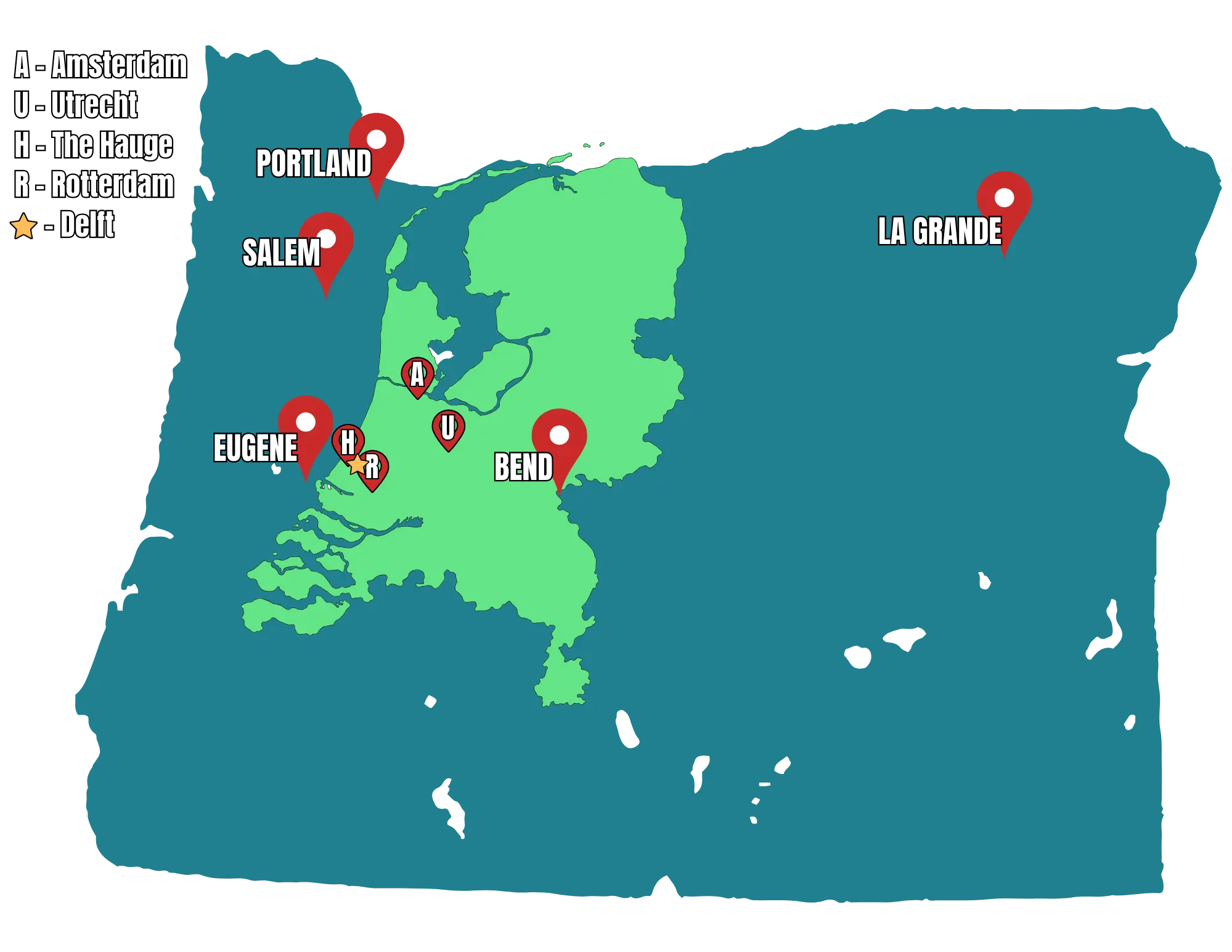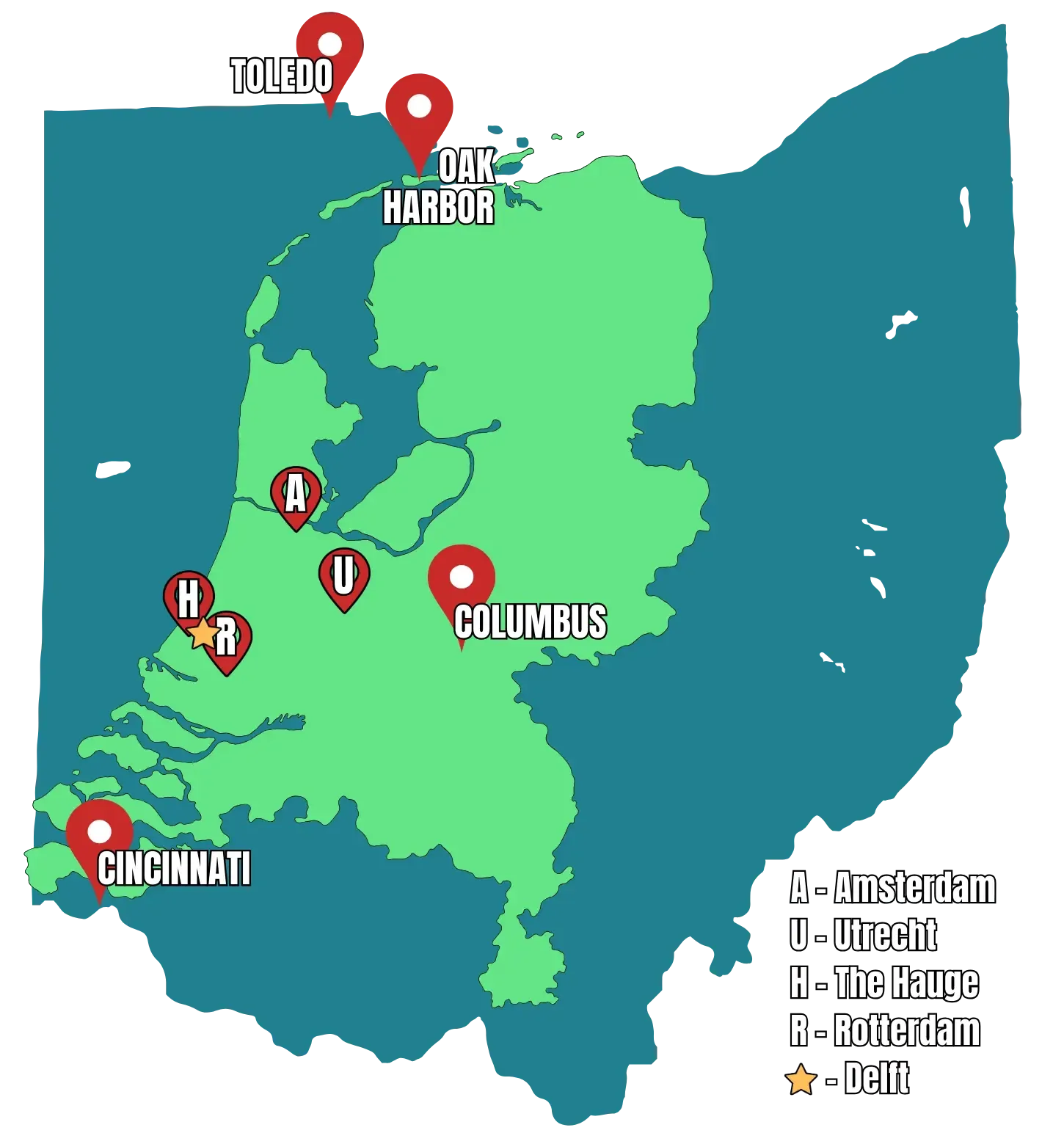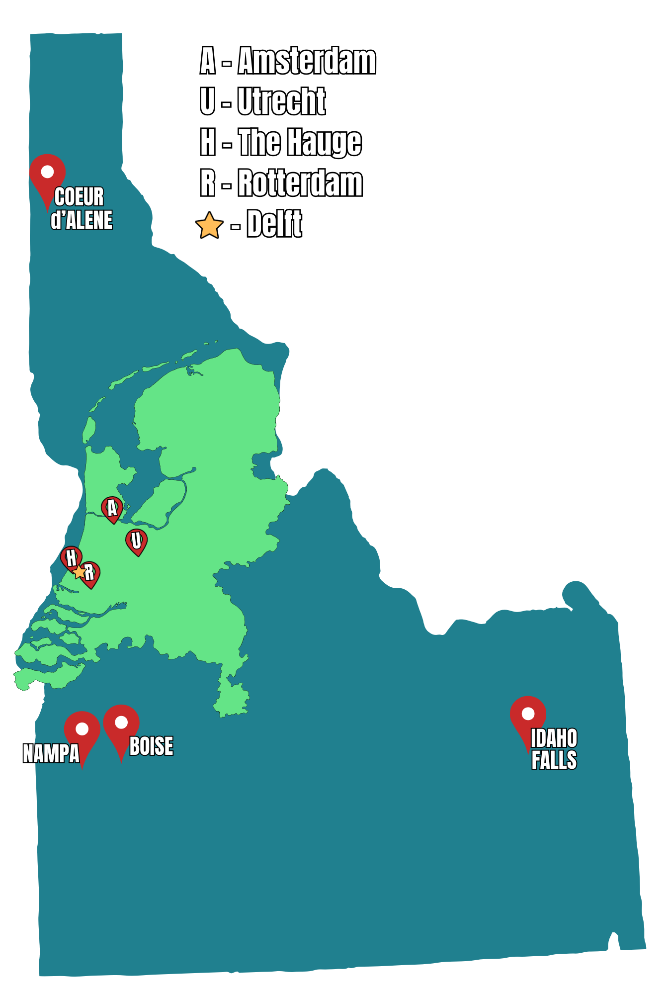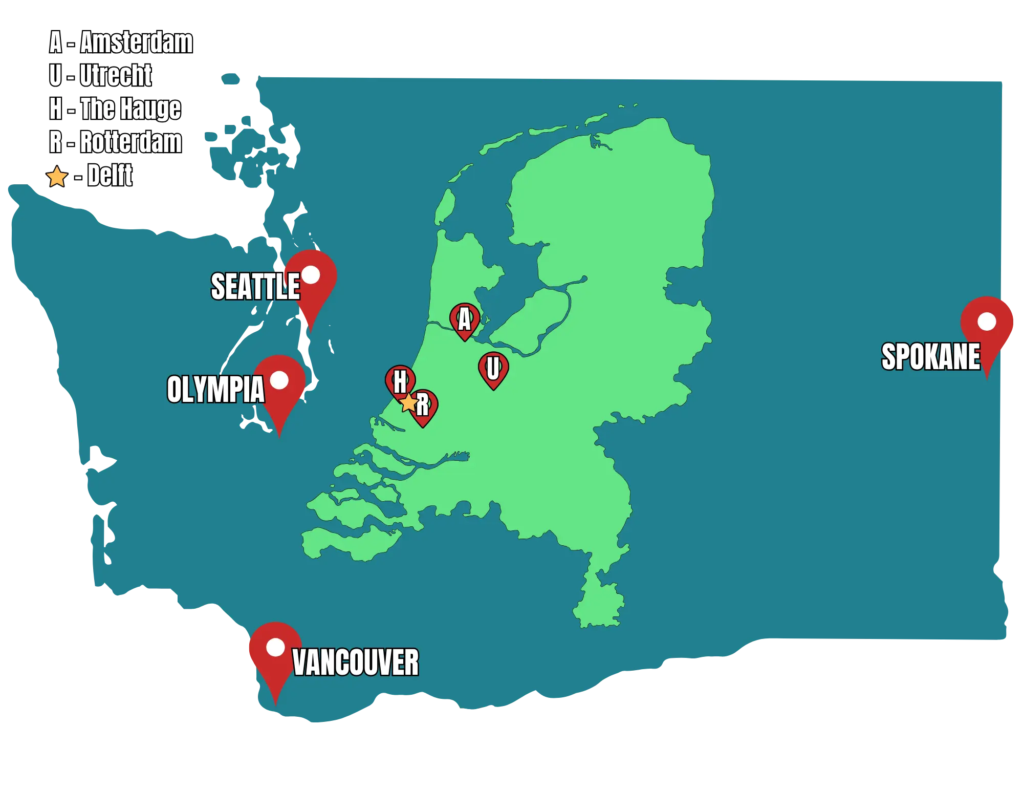 So here's a little graphic I made of just how tiny The Netherlands is compared to some of the states I'm most familiar with, to scale for each state and with some cities for context. Our little town of Delft is nestled in between two of the majors cities, making it hard to mark, but we're there as the yellow star.