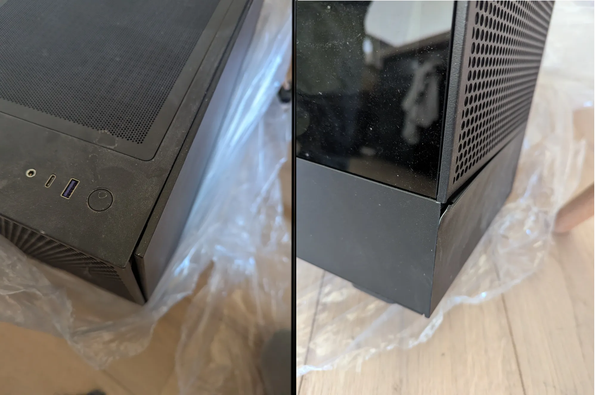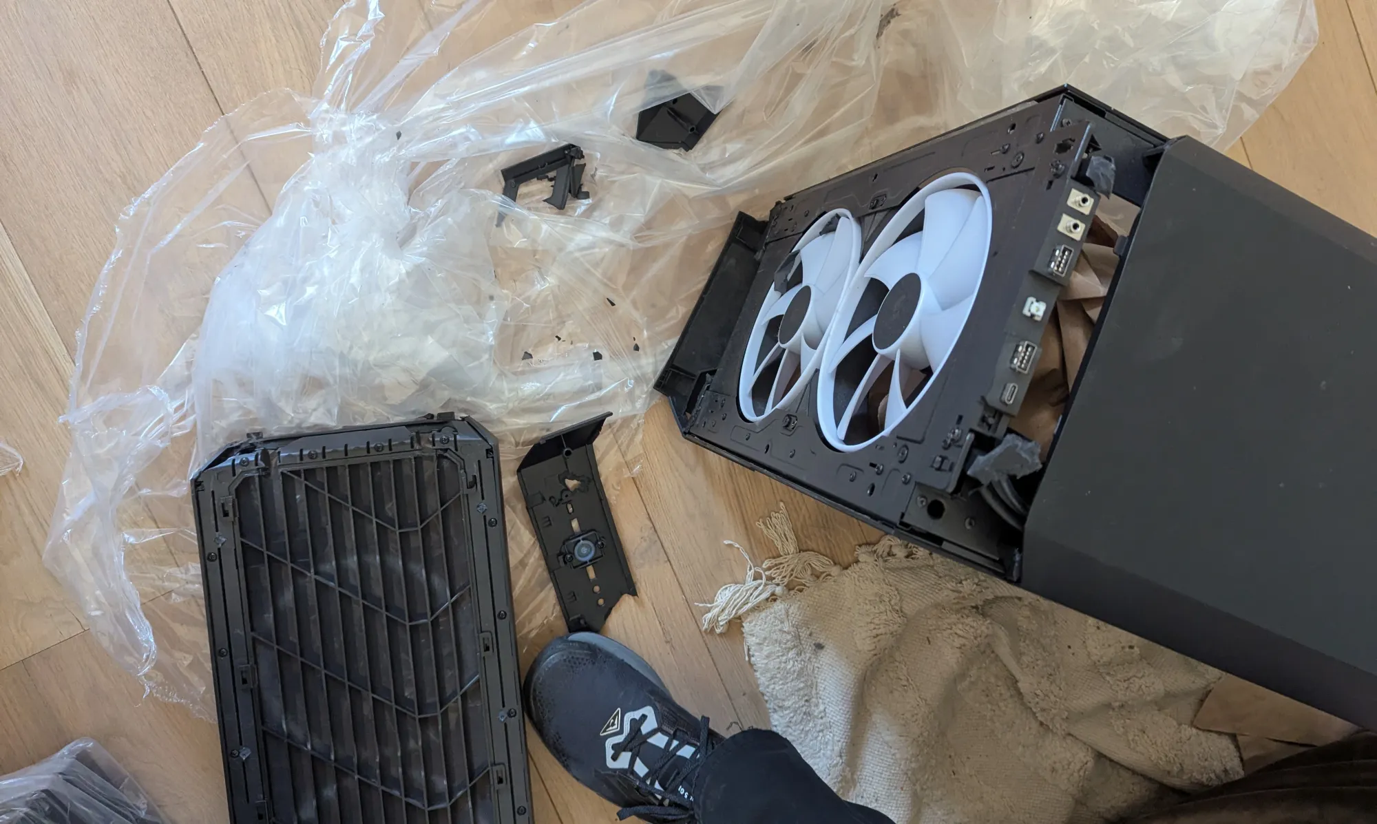 These pictures only scratch the surface of the damage done, CPU fan's ripped out of its threads killing the CPU, CPU fan, and the motherboard in one fell swoop, the front, top control panel, and the top cover refuse to stay on, and the motherboard is nowhere near lining up with its rear IO panel.